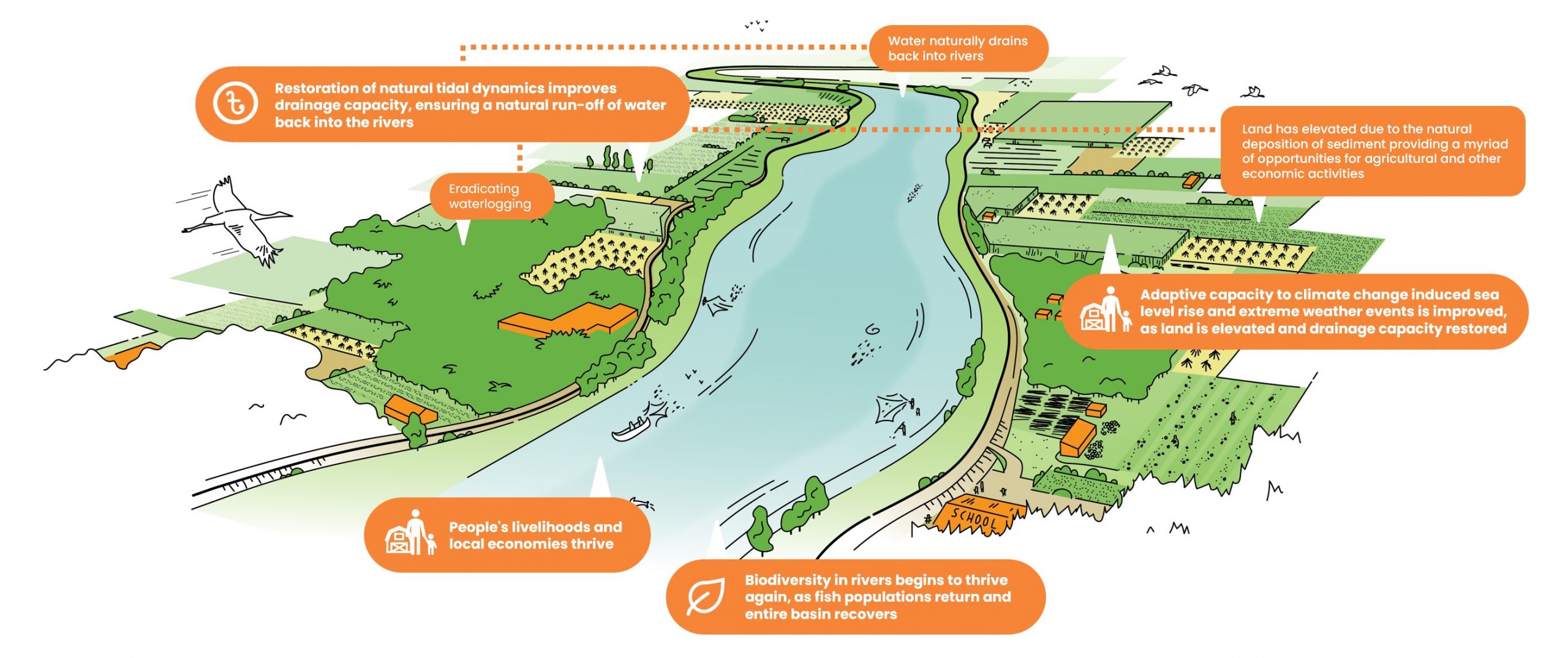 By reconnecting rivers to the main tidal rivers and introducing controlled flooding through “rotational polders”, riverbeds deepen naturally while sediment is redistributed to the floodplains, elevating the land. This nature-based approach reduces waterlogging, strengthens ecosystems and revitalises local livelihoods.